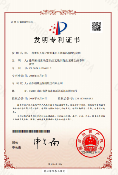 ?重組膠原蛋白:利用合成生物學(xué)技術(shù),科學(xué)選取了人III型膠原蛋白氨基酸序列中高生物活性位點富集片段,通過大腸桿菌高效表達、多級提取純化獲得了高活性、高純度的重組人源化III型膠原蛋白,通過離體皮膚模型在體外高度模擬皮膚的滲透吸收與代謝過程,來實現(xiàn)重組人源化III型膠原蛋白在表皮層、基底膜、真皮層的作用。福瑞達從研發(fā)到生產(chǎn)再到產(chǎn)業(yè)化應(yīng)用,全面打通了重組人源化III型膠原蛋白產(chǎn)業(yè)鏈,并申請發(fā)明專利多件。
