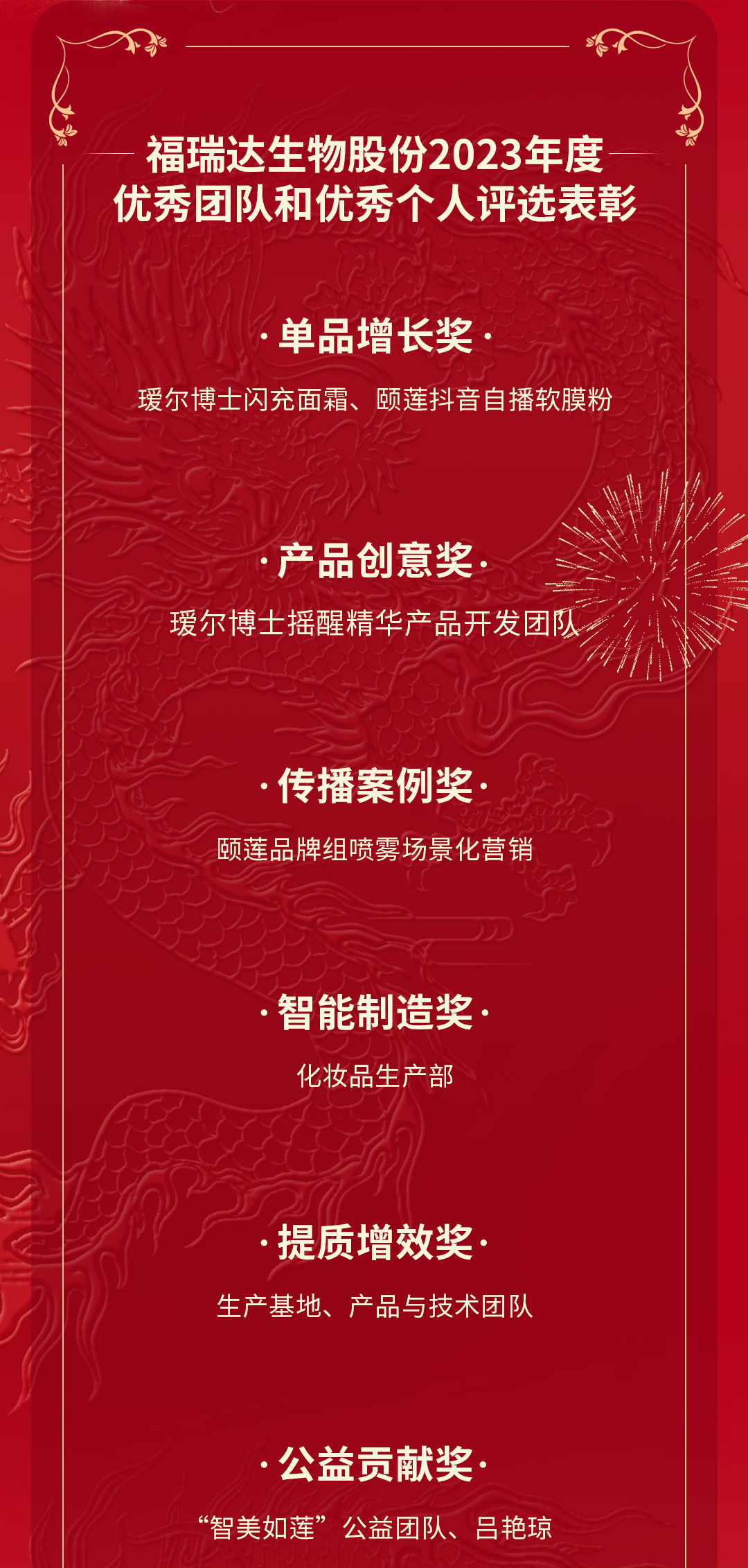 這一年,公司各部門涌現出一批充分發揮奮斗精神和主觀能動性干事創業的團隊和員工。人力資源部近日組織開展2023年度優秀團隊和優秀個人評選,共評出單品增長、產品創意、傳播案例獎、智能制造、提質增效、公益貢獻六個團隊獎和優秀員工、優秀新人、突出管理、基層管理、公益貢獻五個個人獎。會上,對福瑞達生物股份2023年度優秀團隊和優秀個人進行了表彰。