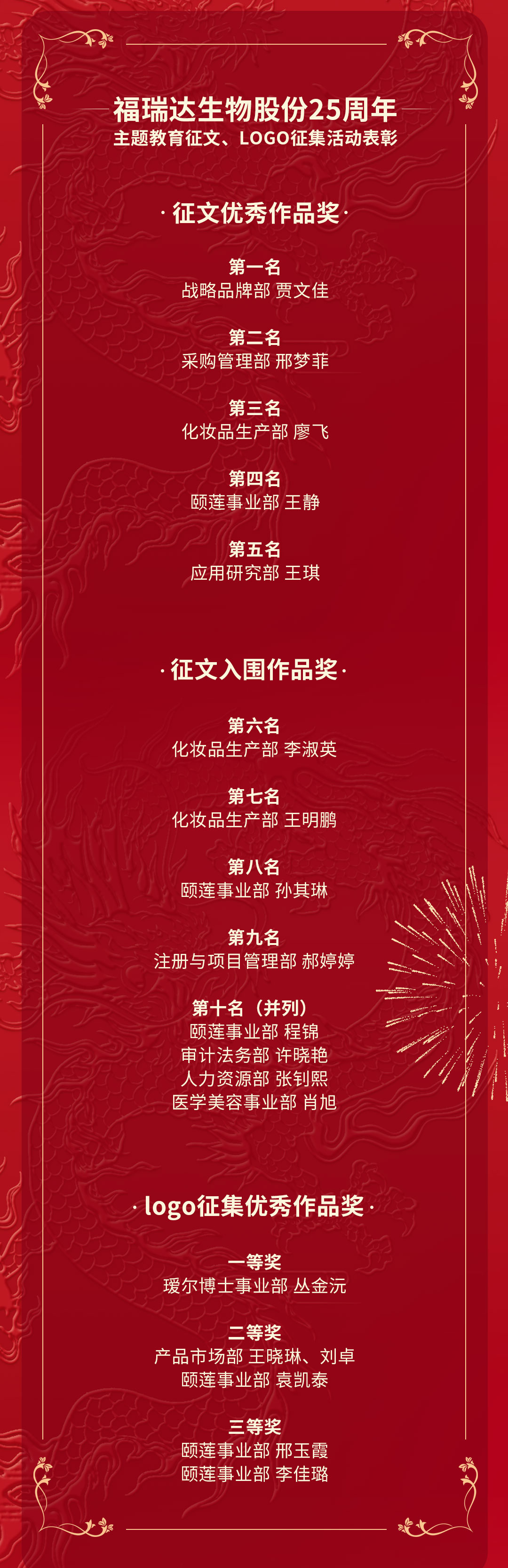2023年值福瑞達生物股份成立25周年之際,戰略品牌部聯合黨支部、人力資源部開展了主題教育征文、LOGO征集系列活動。本次活動自2023年7月開始,各部門員工熱情參與,帶來諸多原創新勢力。經專業評委會評審評定,最終福瑞達生物股份25周年主題教育征文活動評出5份優秀作品獎、5份入圍作品獎,LOGO征集活動評出6份優秀作品獎。會上,對本次活動的獲獎者進行了表彰。