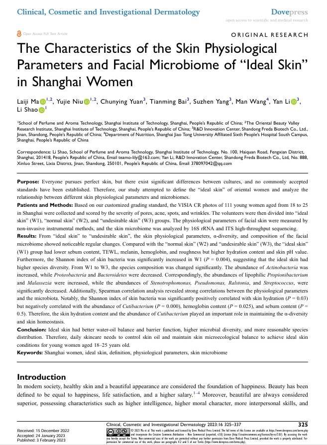 2022年,基于多年對(duì)東方女性皮膚生理參數(shù)和面部微生物菌群的深入研究,瑗爾博士科研團(tuán)隊(duì),首次為“理想皮膚”賦予了具體、可量化的定義,并在國(guó)際期刊上發(fā)表了《The Characteristics of the Skin Physiological Parameters and Facial Microbiome of “l(fā)deal Skin" in Shanghai Women》。